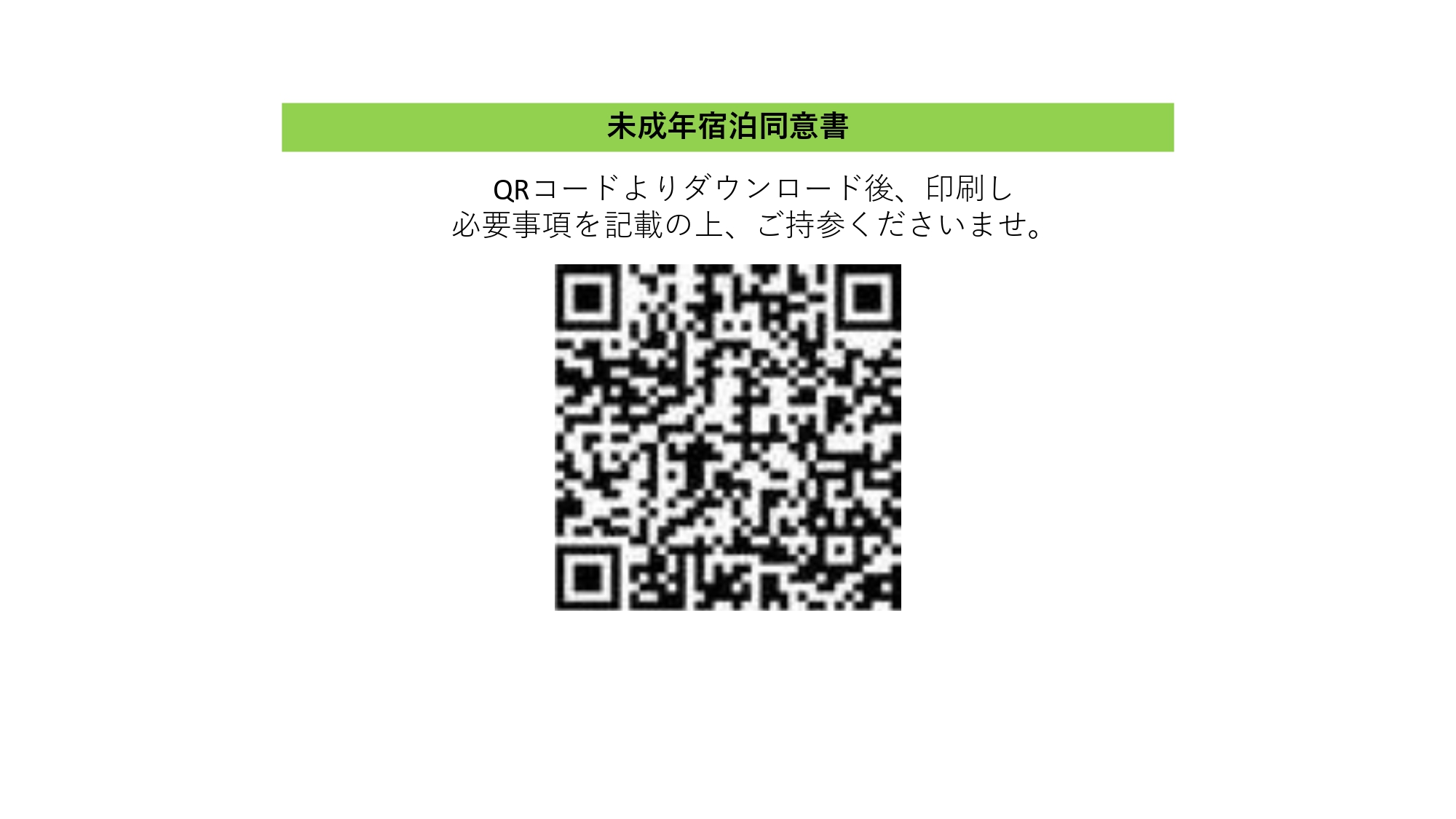 18歳未満の方のみのご宿泊の場合は皆様分の未成年宿泊同意書のご提出が必要です。QRコードよりダウンロードし、チェックイン当日にフロントスタッフにご提出ください。