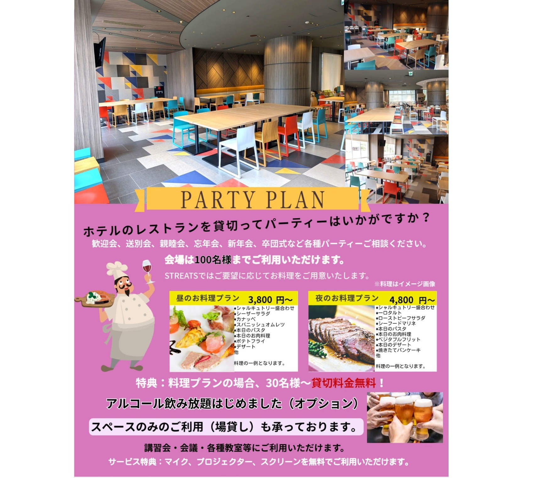 会議、セミナー、貸切ランチなど多岐にわたりご利用いただけます。